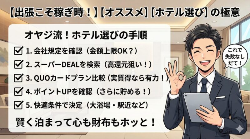 私が出張ホテル選びで「何を基準に得を取るか」を考えた時、重視したい順番は明確に決まっている。以下の3つのステップだ。