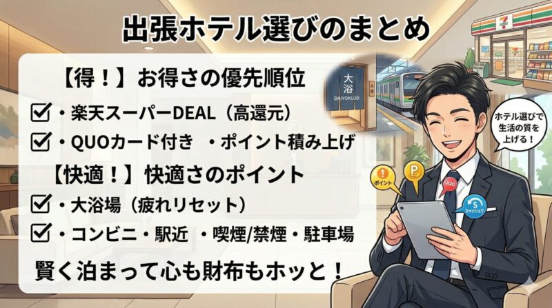 選び方ひとつで、実質的な「お小遣い」になり、疲れの取れ方も、出張中のQOL(生活の質)も天と地ほど変わるんだわ。どうせ会社のお金で泊まるなら、自分にとってメリットの大きいホテルを選んで、しっかり得をしていこう!